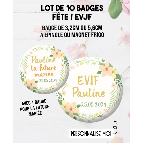 Si vous prenez plusieurs lots, il y aura bien sur qu'une fois le badge pour la future mariée. Taille 32mm ou 56mm à épingle ou magnet frigo.